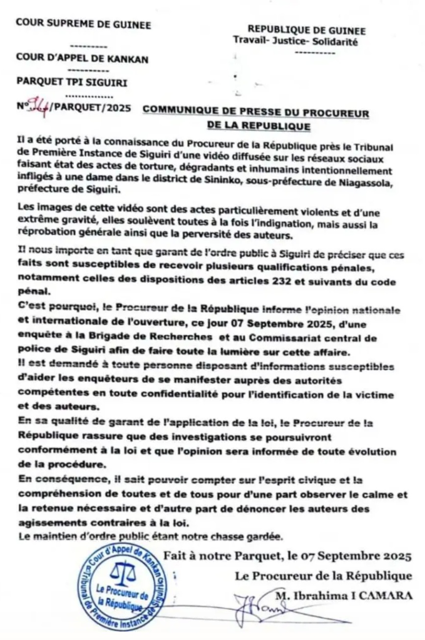 Le Procureur de la République près le Tribunal de Première instance de Siguiri a annoncé, ce dimanche 7 septembre 2025, l’ouverture d’une enquête après la publication sur les réseaux sociaux d’une vidéo montrant des actes de torture infligés à une dame dans le district de Sininko, sous-préfecture de Niagassola.