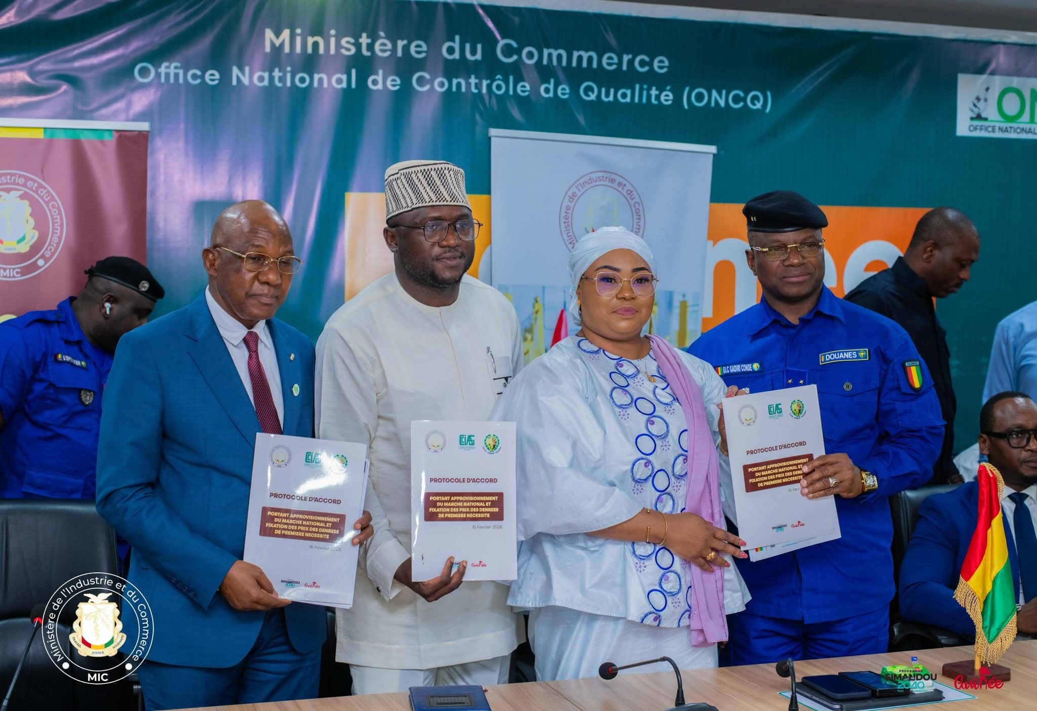 Dans le cadre des efforts visant à stabiliser les prix des denrées de première nécessité sur le marché guinéen, le Ministère de l’Industrie et du Commerce, à travers la Direction nationale du commerce intérieur et de la concurrence (DNCIC), a procédé ce lundi 16 février 2026 à la signature d’un protocole d’accord avec la Chambre de commerce, d’industrie et d’artisanat de Guinée (CCIAG) et la Direction générale des Douanes.