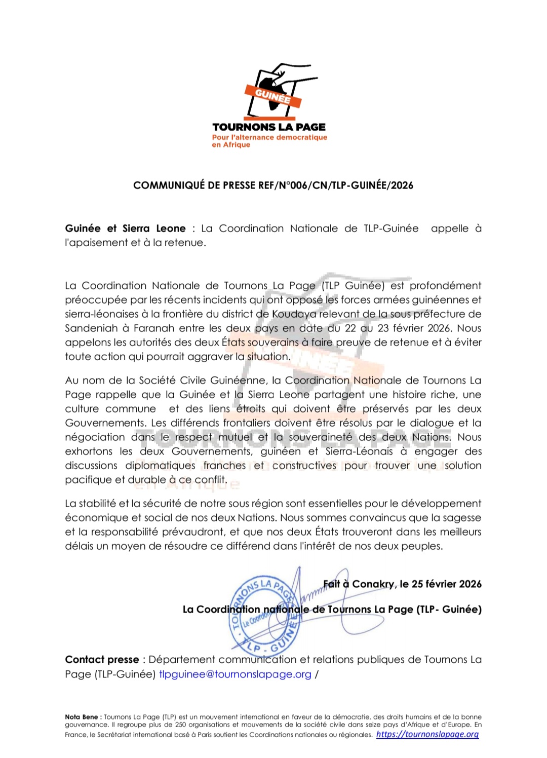La Coordination Nationale de Tournons La Page (TLP Guinée)  se dit profondément préoccupée par les récents incidents qui ont opposé les forces armées guinéennes et sierra-léonaises à la frontière du district de Koudaya relevant de la sous préfecture de Sandeniah à Faranah entre les deux pays en date du 22 au 23 février 2026. A cette circonstances, elle appelle  les autorités des deux États à faire preuve de retenue et à éviter toute action qui pourrait aggraver la situation.
