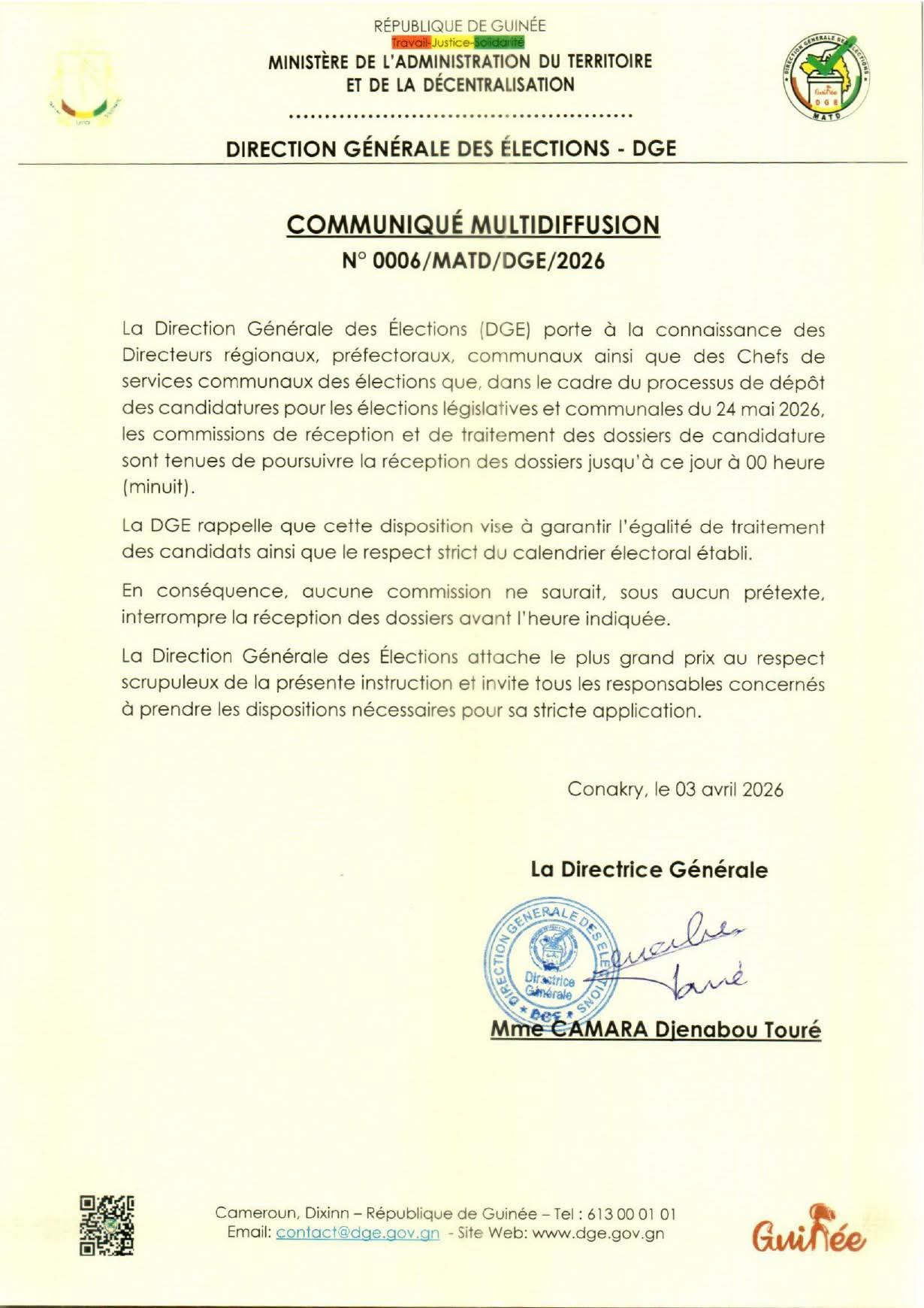 À l’approche des élections législatives et communales prévues pour le 24 mai 2026, la Direction Générale des Élections (DGE) tape du poing sur la table. Dans un communiqué publié ce vendredi 03 avril, l’institution électorale ordonne le maintien de la réception des dossiers de candidature jusqu’à minuit.