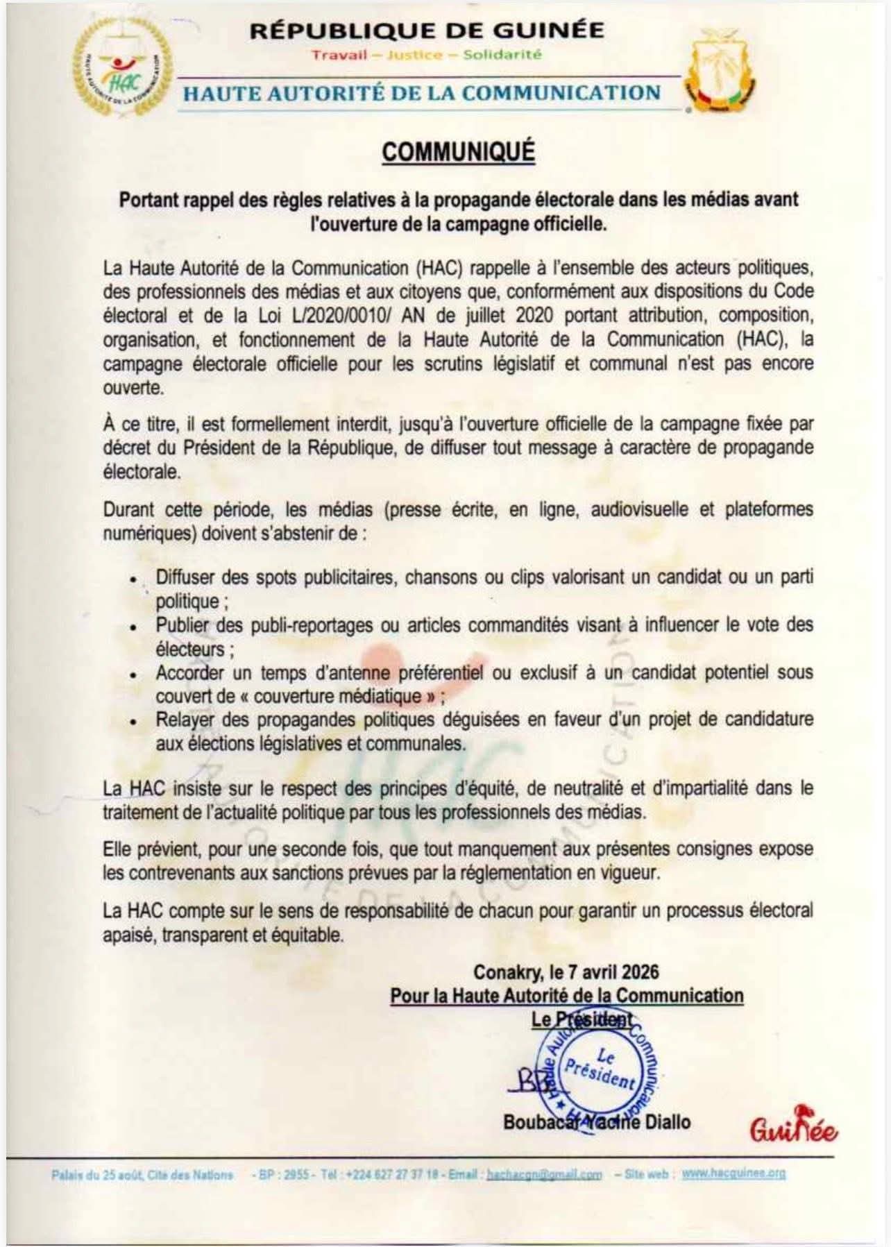 À travers un communiqué publié ce mardi 7 avril 2026, la Haute Autorité de la Communication (HAC) a rappelé à l’ordre les acteurs politiques et les médias. L’institution de régulation interdit formellement toute campagne déguisée avant l’ouverture officielle des campagnes  des scrutins législatifs et communaux.