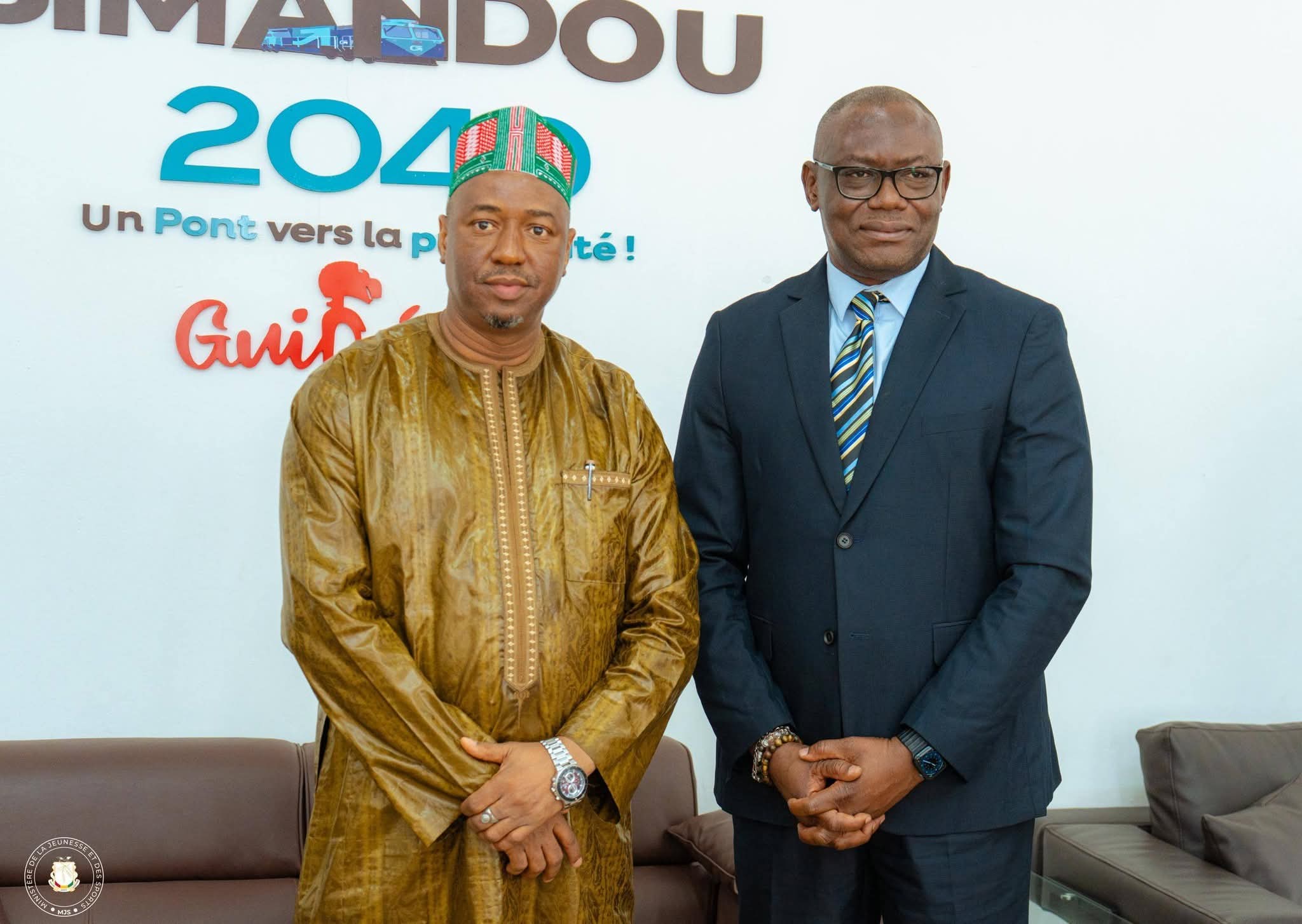 Ce vendredi 10 avril 2026, le ministre de la Jeunesse et des Sports, Mamadou Cellou Baldé, a accordé une audience à M. Guy Aho Tété Bénissan, représentant pays de France Volontaires en Guinée. Lors de cette rencontre, M. Bénissan a félicité le ministre pour sa nomination récente et réaffirmé la disponibilité de son organisation à renforcer le partenariat existant avec le département. Il a fait le point sur l’accord signé en 2024 avec l’Agence nationale pour le volontariat de la jeunesse (ANVJ), d’une durée de cinq ans, et salué sa bonne mise en œuvre à ce jour.