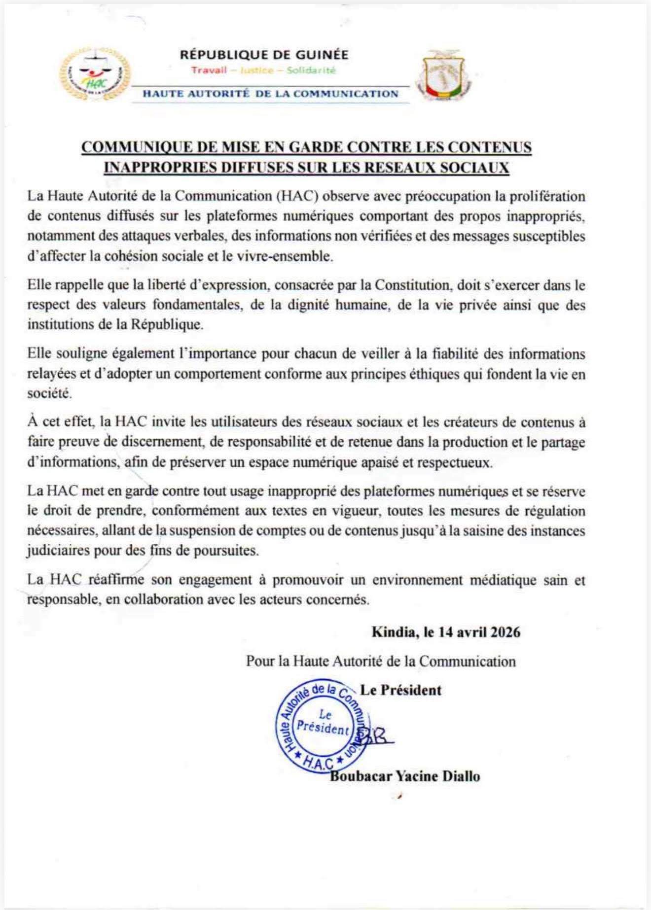 Dans un communiqué publié le 14 avril 2026, la Haute Autorité de la Communication (HAC) a exprimé sa profonde préoccupation face à la recrudescence de contenus jugés inappropriés sur les plateformes numériques.