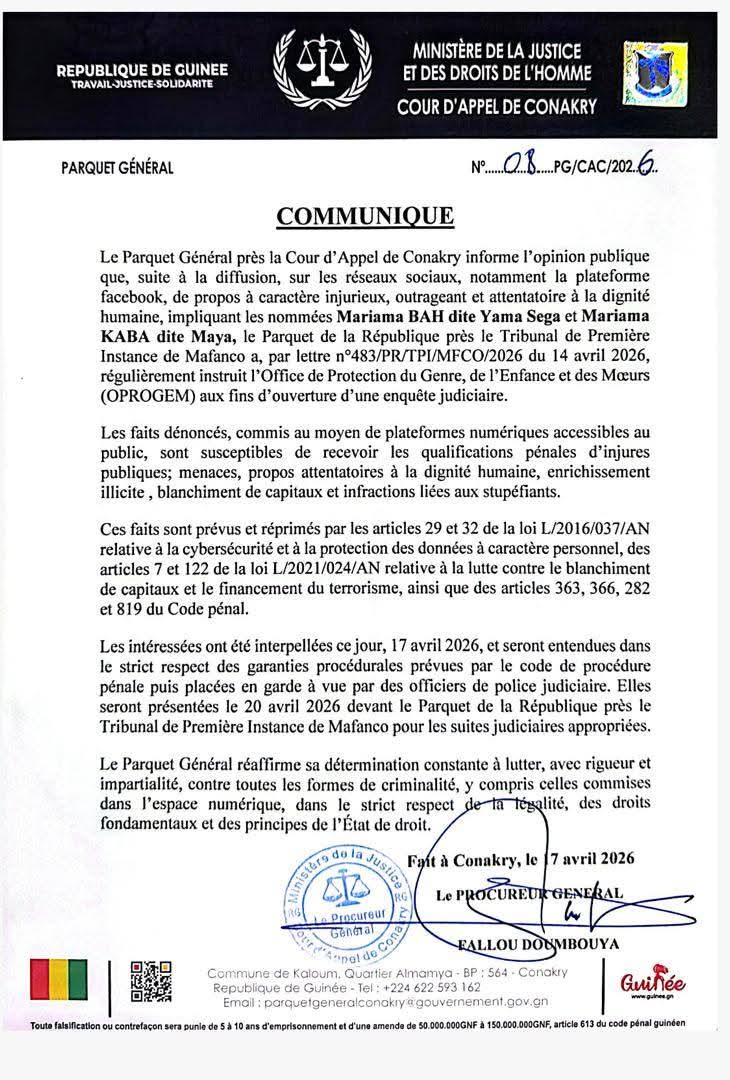 Le Parquet Général près la Cour d’Appel de Conakry a annoncé, ce vendredi 17 avril 2026, l’interpellation de deux figures des réseaux sociaux : Mariama Bah, alias « Yama Sega », et Mariama Kaba, dite « Maya ». Elles sont visées par une enquête judiciaire d’envergure mêlant cybercriminalité et délits financiers.