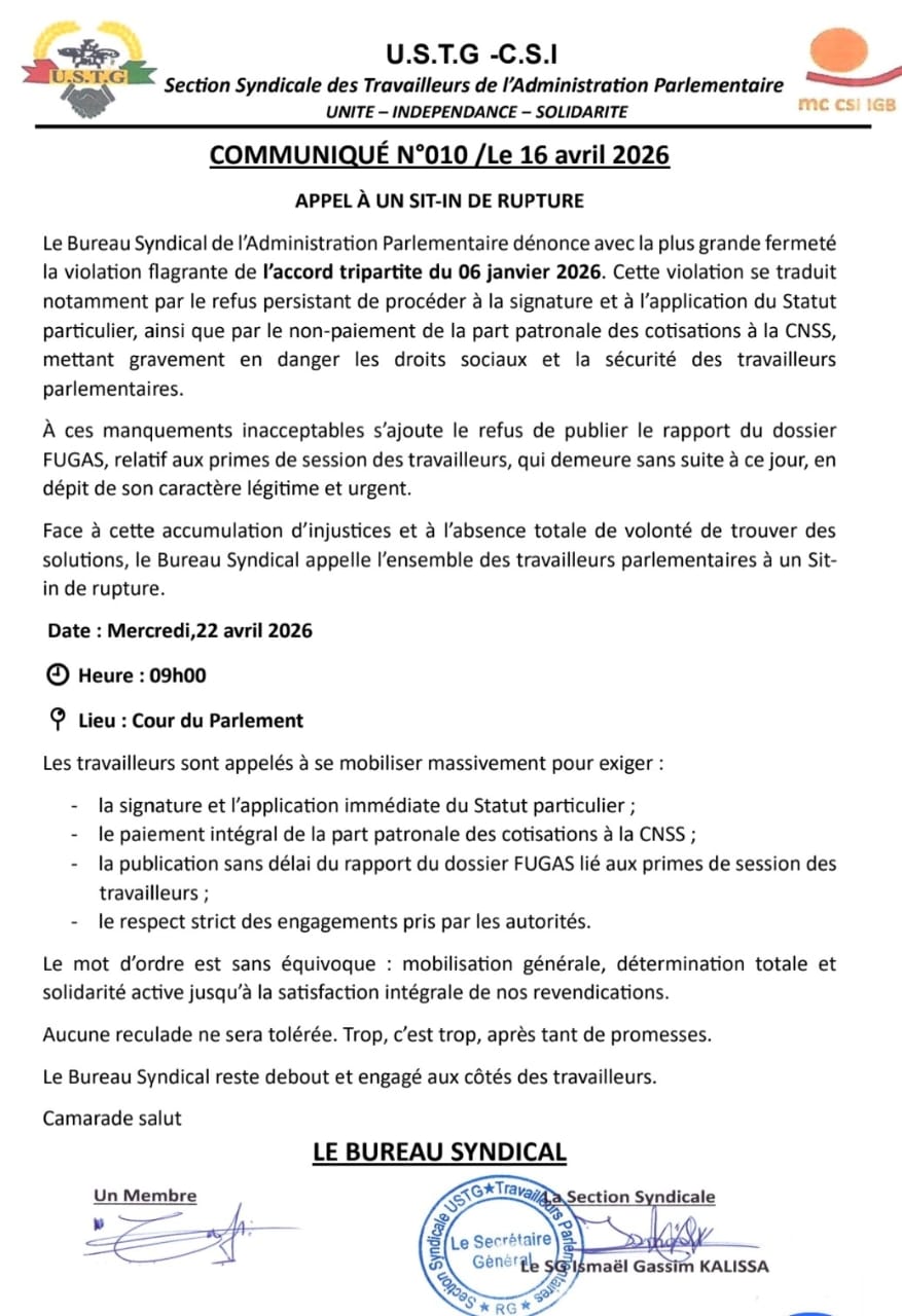Face à ce qu’il qualifie de « violation flagrante » des accords passés, le Bureau Syndical de l’Administration Parlementaire durcit le ton. Un rassemblement est prévu ce mercredi 21 avril 2026, devant l’institution pour exiger l’application immédiate de leurs droits sociaux.