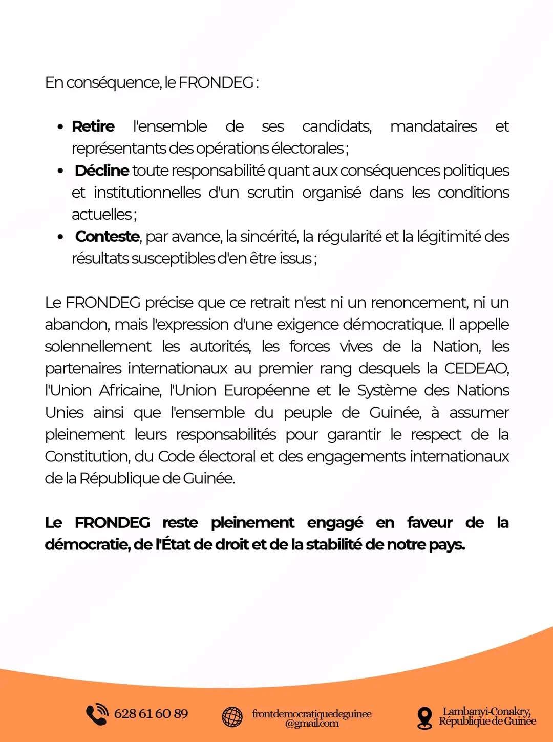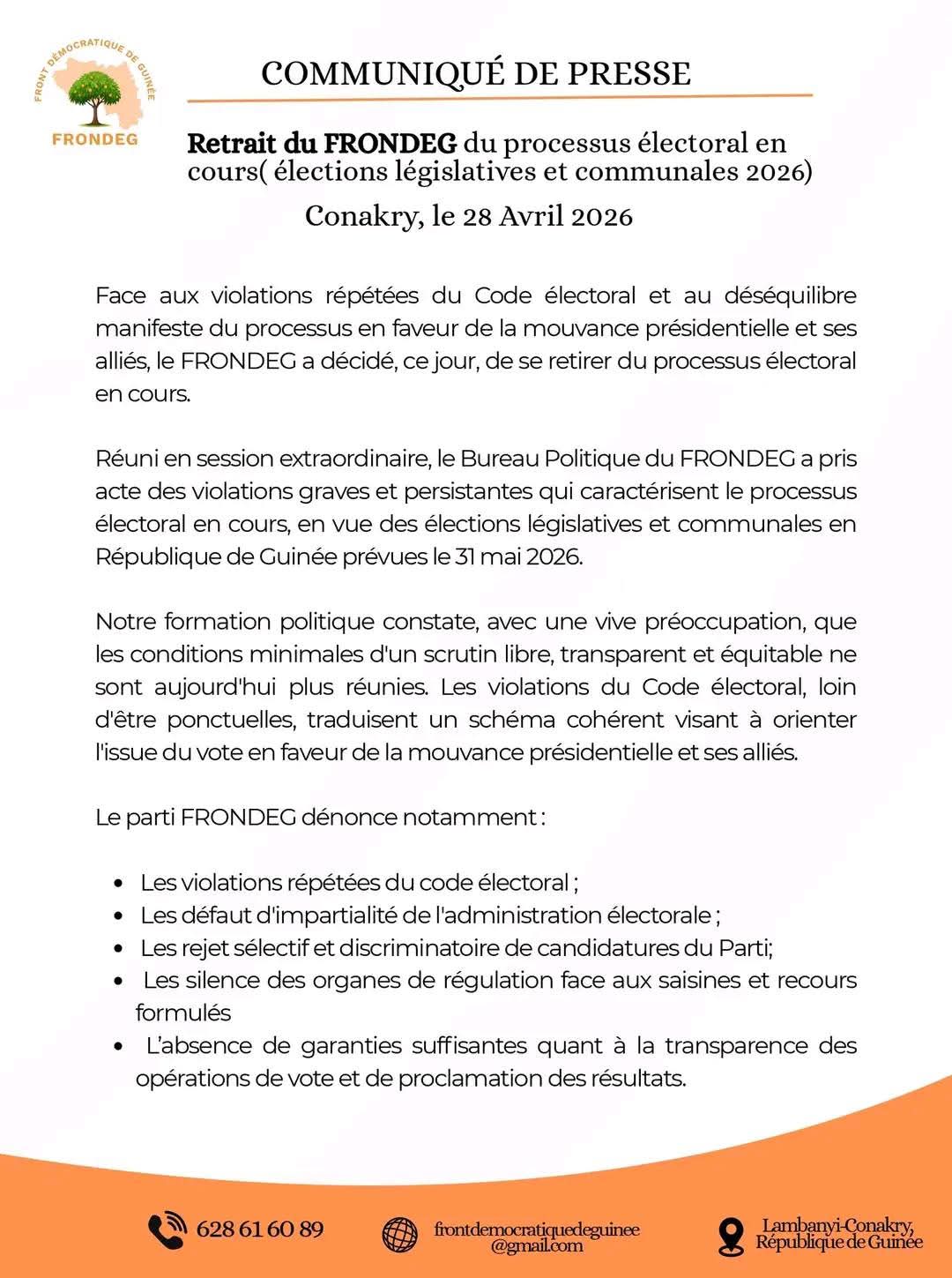 À un mois des élections législatives et communales prévues pour le 31 mai 2026, le paysage politique guinéen subit un important séisme. Par un communiqué officiel daté du 28 avril 2026, le Front Démocratique de Guinée (FRONDEG) a annoncé son retrait pur et simple de la course électorale.