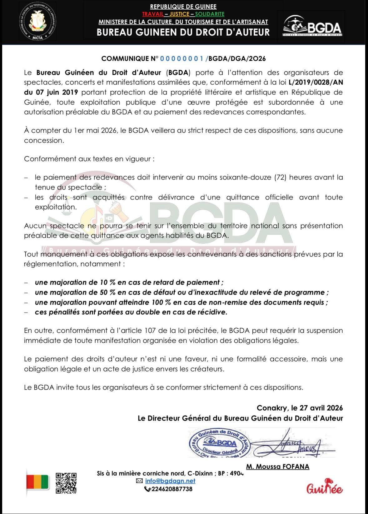 Dans un communiqué officiel, le Bureau Guinéen du Droit d’Auteur (BGDA) a rappelé à l’ordre les organisateurs d’événements culturels. À partir du 1er mai 2026, la rigueur sera de mise : aucun spectacle ne sera toléré sans le respect strict des obligations liées aux droits d’auteur.
